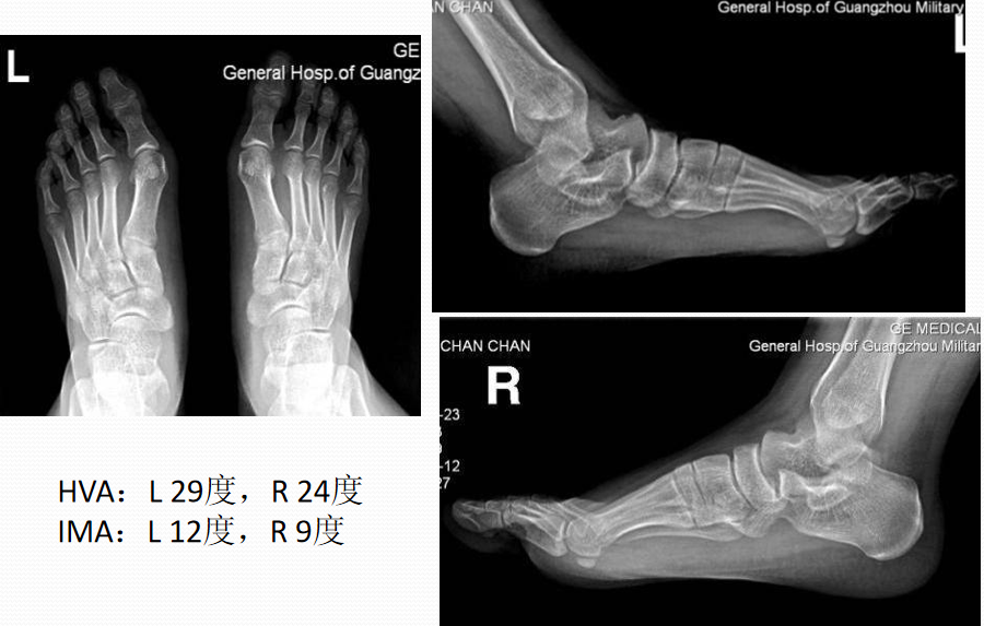 1:前后位观察和测量拇外翻角(HAA) :拇趾跖骨中轴线与近节趾骨中轴线之夹角。正常为15°~20°