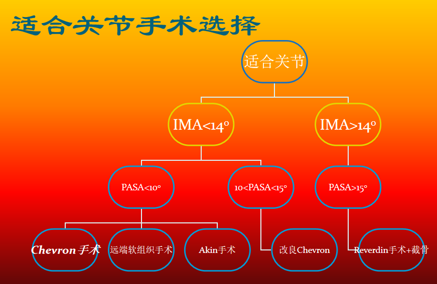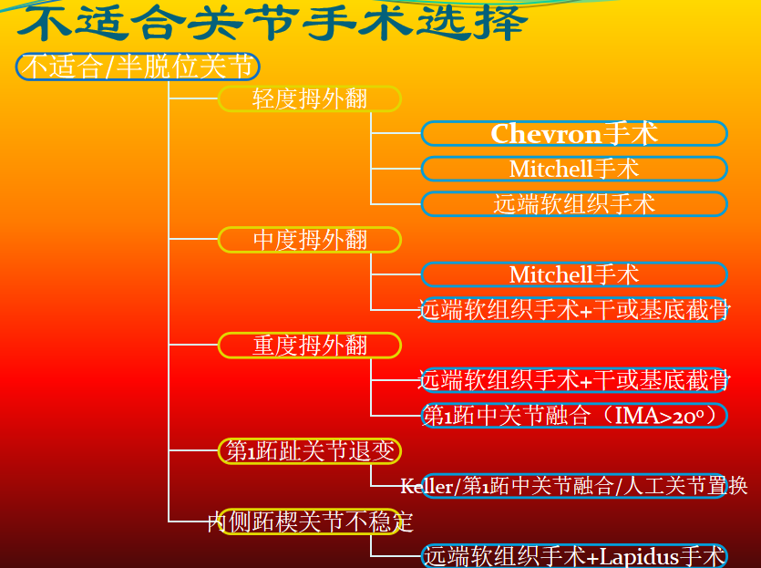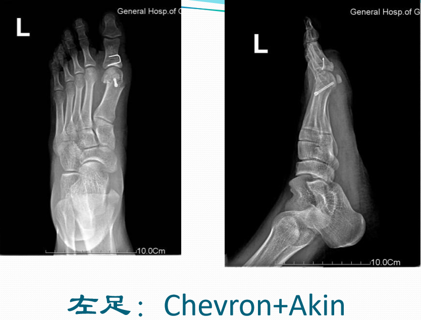 Weil截骨术:转移性跖骨痛第一趾骨近节Akin截骨术:趾骨内侧楔形截骨,两侧打孔,闭合截骨面,固定。适应症:DMAA增大且跖趾关节适合者。可单独使用,纠正单纯趾骨外翻。多于其他手术后拇趾仍有外翻时合用。不适用于跖趾关节不适合或半脱位的病人,可加重畸形。