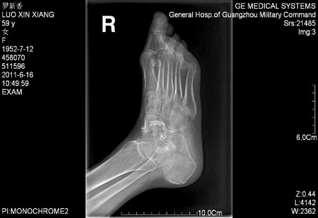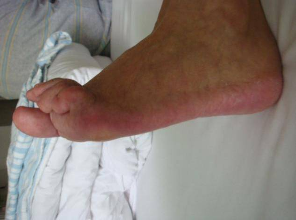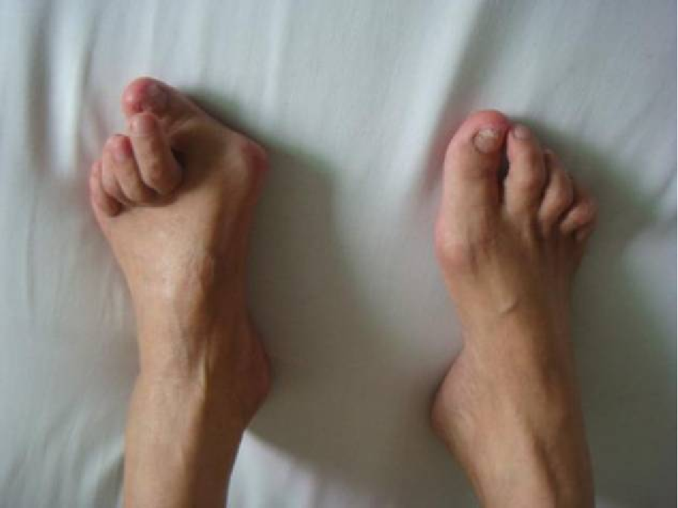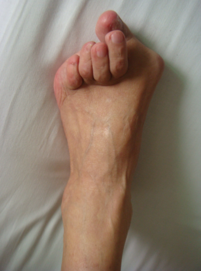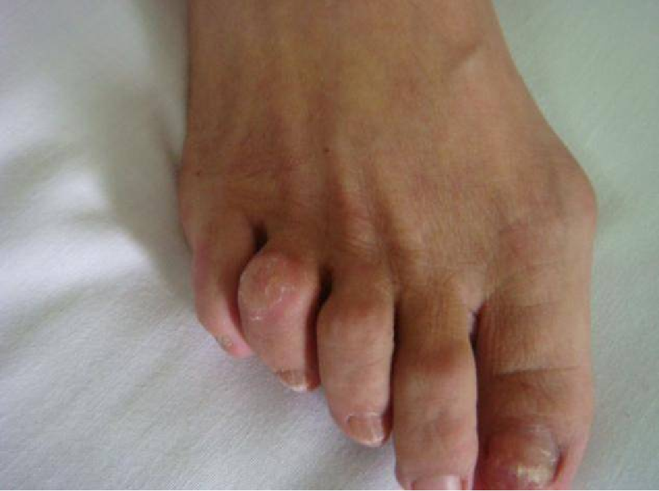 右足:第4趾爪形趾,趾间关节胼胝,疼痛。