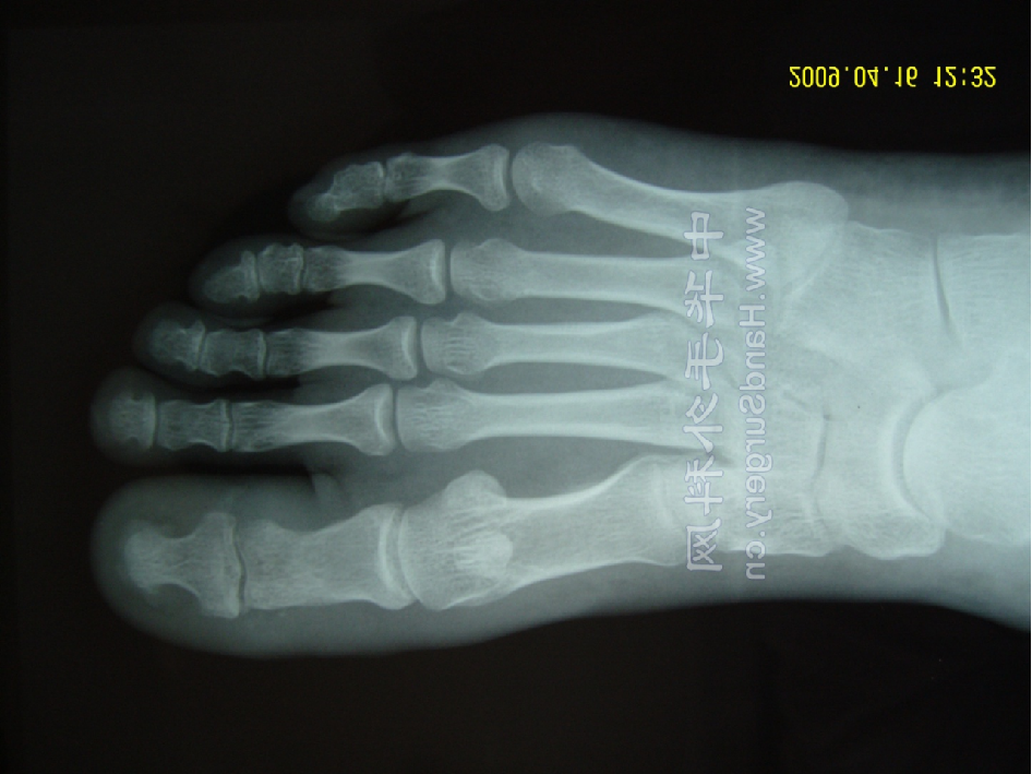 中期(半脱位期) 拇趾明显外翻畸形拇囊炎疼痛较重,X线片可见拇趾近节基底,自跖骨头向外侧半脱位,因拇趾向外挤压第2趾,该趾可发生锤状趾畸形,以致跖骨头下陷,并发跖骨头部胼胝,此期手法虽可搬正,但不能巩固。对于30~50岁妇女,跖趾关节外翻角在15°-- 25°之间,跖骨间角<12°,趾间关节角<15 °,跖趾关节无退行性变,非手术治疗无效者,适于McBride等软组织手术。