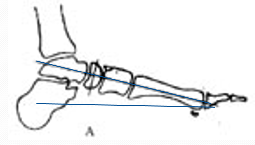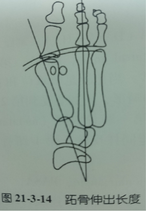 第1跖骨相对于距骨关系 比较距骨颈中轴线和第1跖骨中轴线的关系。正常两线应当重叠。跖骨线位于距骨线背侧时,表示跖骨头背伸。跖骨线位于距骨线跖侧时,表示跖骨头跖屈。