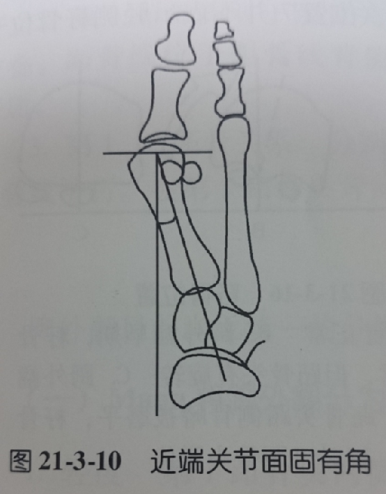 近端关节面固有角(PASA或DMAA) 第1跖骨远端关节面内、外两点引一连线,跖骨中轴线与上述连线有一交点,经此交点做关节面连线的垂线,该垂线与跖骨中轴线的夹角。正常人一般<7.5°。