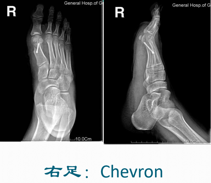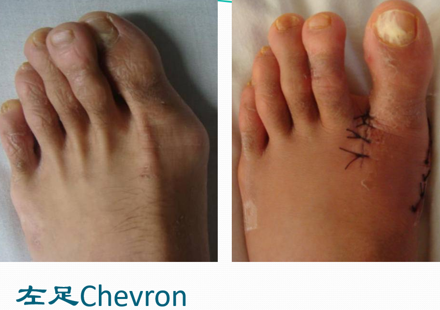 第1跖骨远端Chevron截骨术1.于第1跖骨头内侧作水平位“V”形截骨,开口向近端,截骨后将远端跖骨头向外侧推移3-5mm,切除多余骨质,固定截骨面。2.利用截骨时轴线的变化可以调整跖骨头位置和第1跖骨长度。