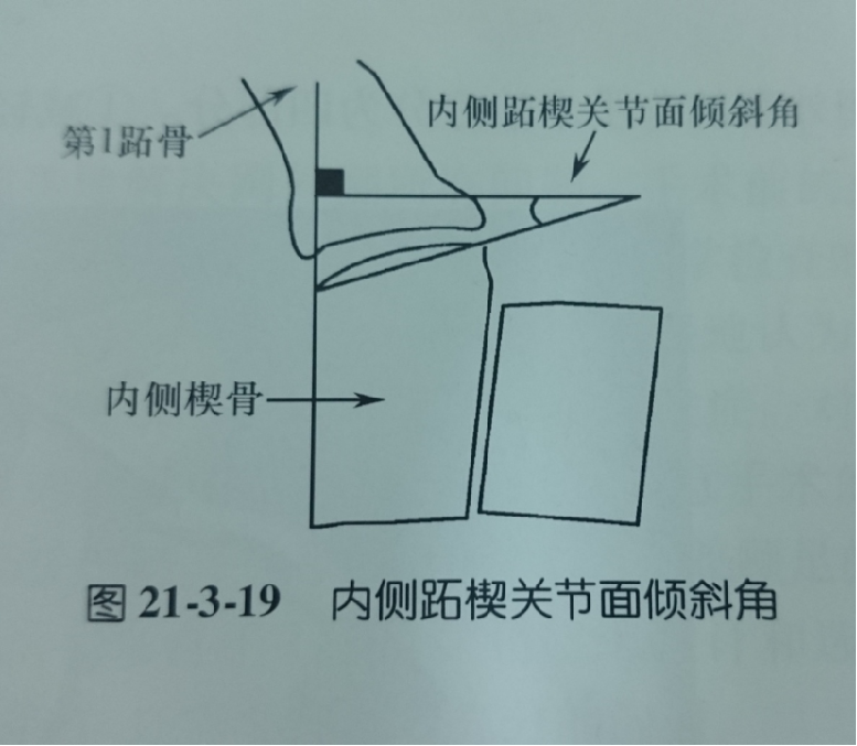 内侧跖楔关节面倾斜角(MTCA) 从内侧楔骨内侧缘划一连线,内侧楔骨远端关节面作一连线,后者与前者垂线的交角。一般为8°~10°。