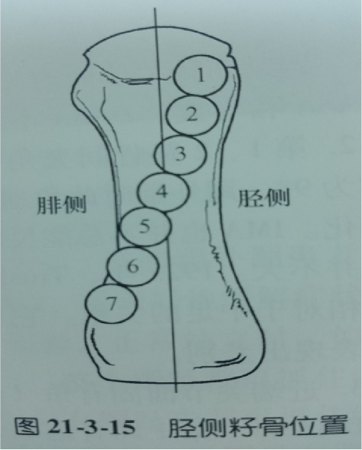 胫侧籽骨位置(TSP) 观察胫侧籽骨相对于第1跖骨中轴线的关系,将籽骨从跖骨头颈部的胫侧缘向腓侧缘划分为7个部位。