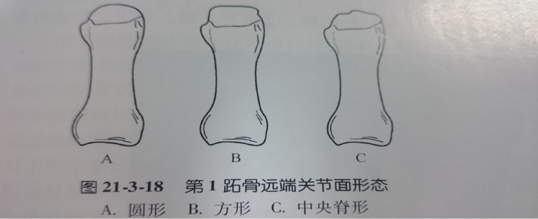 第1跖骨远端关节面形态 从前后位X线上可以观察到第1跖骨头有着不同的形态。一般可分为三种:①圆形,比较不稳定。②方形,较稳定。③中央脊形,较稳定