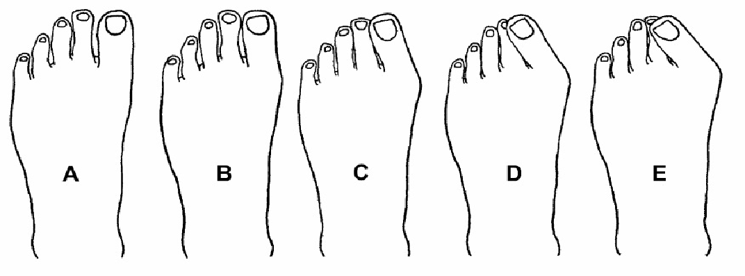 A为正常,B图中拇外翻角约15°,C、D、E的拇外翻角以15°递增。