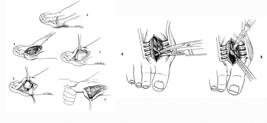 常用手术软组织松解术(McBride)1.内侧切口:切除拇囊,切除骨突。2.外侧切口:切断拇收肌腱止点,悬韧带和跖间横韧带,纵行切开关节囊。
