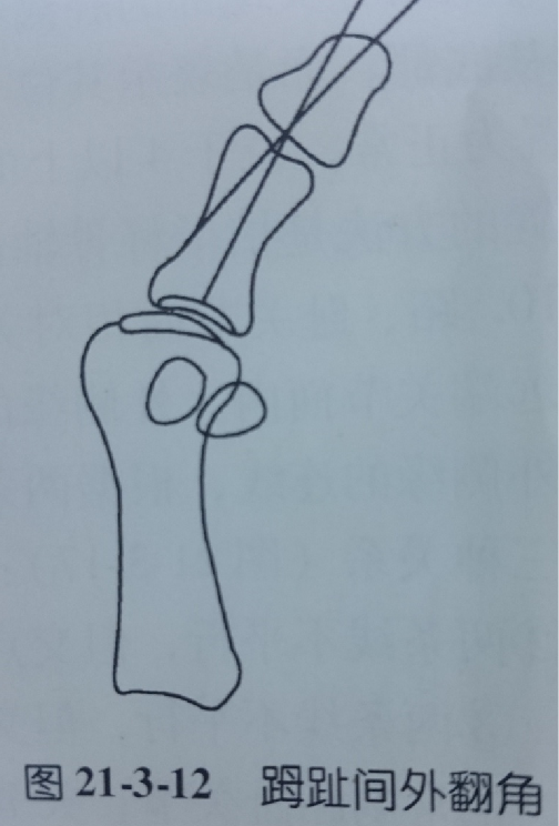 拇趾间外翻角(HAIA) 拇趾远、近节趾骨中轴线交角。正常<10°。