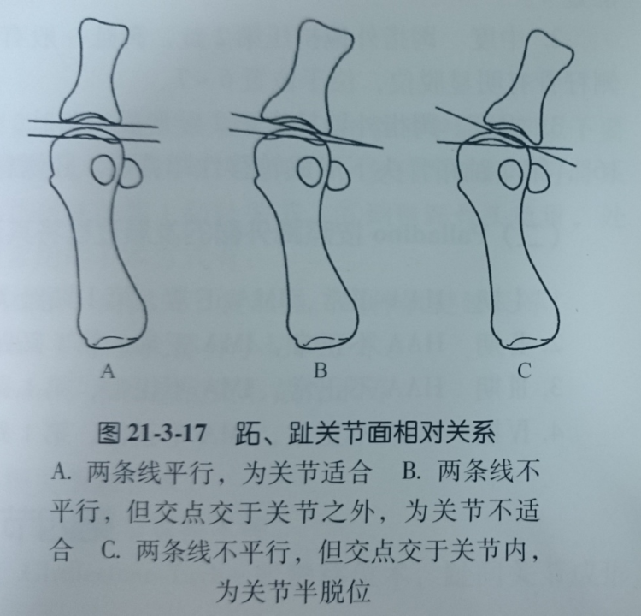 跖、趾关节面相对关系:分别连接第1跖趾关节跖骨远端关节面内、外侧缘的连线和近节趾骨近端关节面内、外侧缘的连线,根据两条关节面连线的相对关系,可分为三种关系
