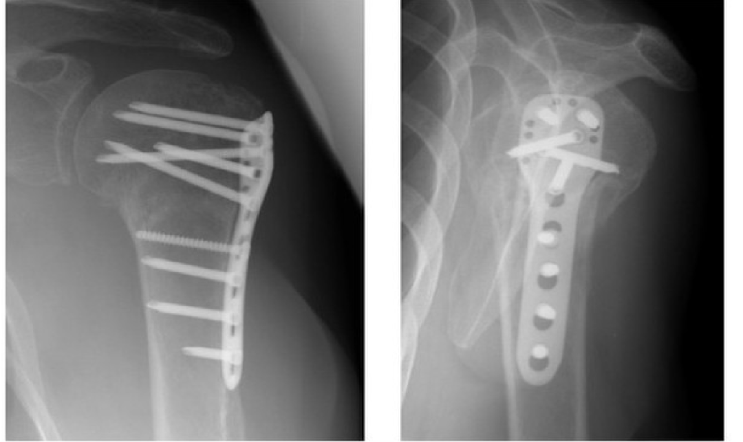 - 结节骨折块复位不佳,被肱骨头螺钉或强韧的缝线固定在不恰当的位置。这可能导致继发性移位或肩峰下撞击,移位大于5mm时尤其如此。
