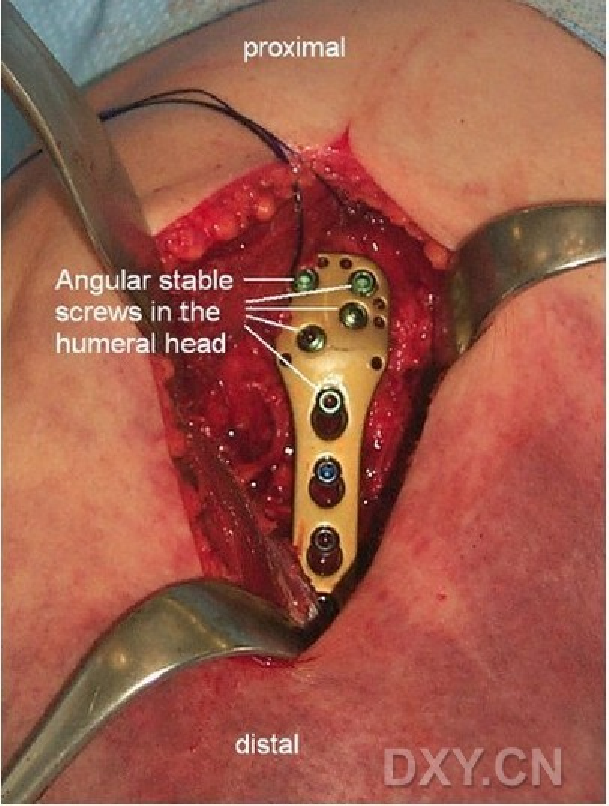 在直视下进行被动活动,检查固定的稳定性,然后在拍摄X线影像,特别需要注意的是复位的结果、钢板的位置、固定的稳定性以及螺钉的长度等。由于肱骨头内的螺钉方向各异,因此必须在影像增强器监视下旋转上臂确定每一枚螺钉的位置都准确无误,最后拍摄腋位X线影像。最后冲洗创口,逐层缝合。术后拍摄X线片记录骨折复位和内置物的位置