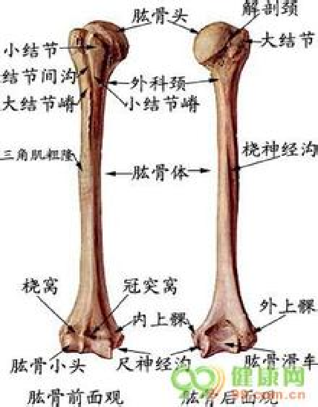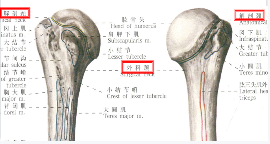 在肱骨头的关节面的边缘与肱骨结节之间有一浅沟,即解剖颈。外科颈相当于圆形的骨干与两结节交接处,此处的皮质突然变薄,为骨折好发处。