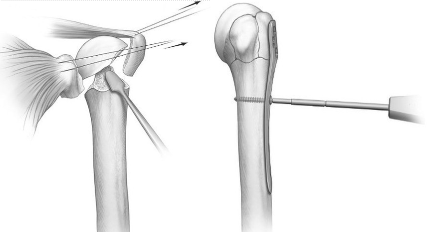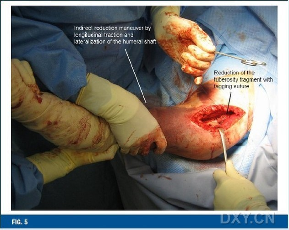 在胸大肌上缘找到由头侧延续而来的肱二头肌长头腱。在结节间沟处通常存在骨折线,将大结节和小结节分割为各自独立的骨折块。如果结节间沟无法重建,或者肱二头肌长头腱已经破损,可在骨折复位固定结束后进行肌腱的原位固定。 应用间接复位手法,无需暴力通常可达成复位。纵向牵引上臂,外展或内收,旋转,侧向推移肱骨干,同时牵拉缝线。