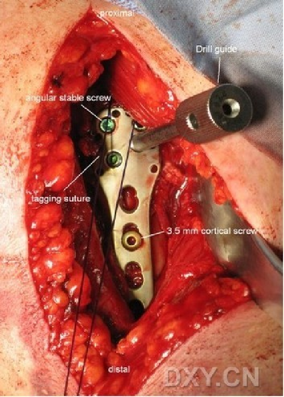 肱骨近端锁定钢板应放置在肱骨大结节顶端以远5-8mm处。缝线穿过钢板上的小孔打结固定,这样可以对抗肩袖的张力,进一步增加骨折固定的稳定性。