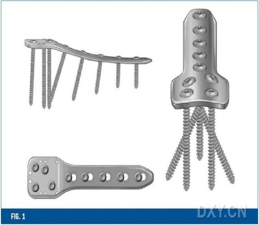 锁定钢板内固定肱骨近端锁定钢板:目前是肱骨近端骨折有效的固定方式之一。其外形与肱骨近端外侧面的解剖形态相吻合,即使骨质疏松症的患者,也可以可靠地固定肱骨头及相关的骨碎块。这主要因为螺钉与钢板锁定以后形成角稳定装置,并且螺钉在肱骨头内呈三维分布。肱骨近端锁定钢板与肱骨近端外侧面的解剖形态相匹配,作为一种内固定支架,通过角稳定装置可维持骨折的解剖复位。肱骨头内四枚锁定螺钉的分布方向各异,构成一个三维立体结构。钢板上另设计有小孔,通过这些小孔可用缝线或钢丝进行固定。对于粉碎性骨折,这一方法可将大结节和小结节骨折块聚拢,重新固定,并可对抗肩袖各肌肉对骨折块的牵拉。
