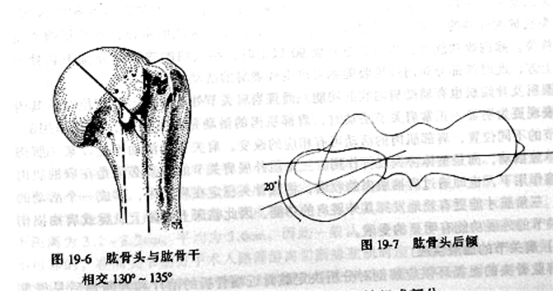 肱骨头的关节面呈半圆形,朝上、内、后。正常肱骨头与肱骨干之间有140-180度的内倾角和15度的后倾角。