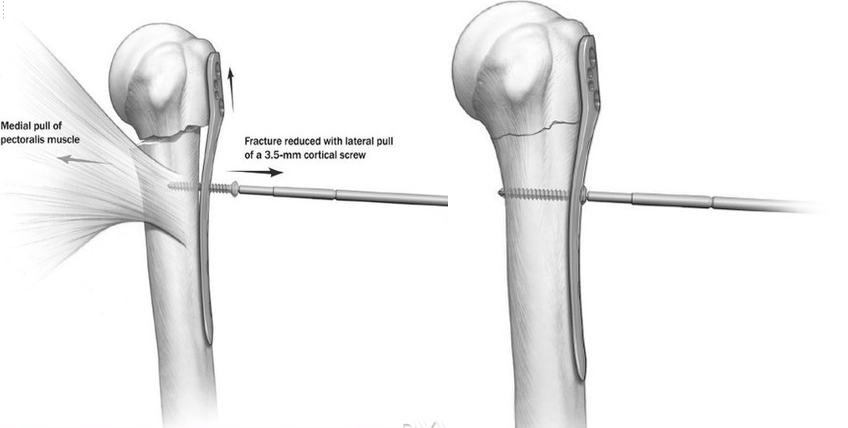 由于胸大肌的牵拉,颈部骨折的病例肱骨干通常都向内移位。通过纵向牵引并向外侧牵拉常可部分复位,如同时将肱骨干骨折块逐渐向钢板靠拢便可获得满意的复位。为了达到这一目的,先将钢板固定在肱骨头外侧面,而此时骨干可能仍然存在向内移位,在骨折线远端的第一个螺钉孔置入一枚3.5mm皮质骨螺钉将肱骨干向外提拉复位。