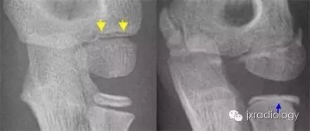 黄箭骨折;蓝箭是骨骺裂。留下轻微的外侧髁骨折。位移小于 2 毫米,可能很稳定。对一个不同的案例。倾斜的视图给人留下了断裂的良好印象。蓝色箭头表示桡骨骺裂(正常变异型)