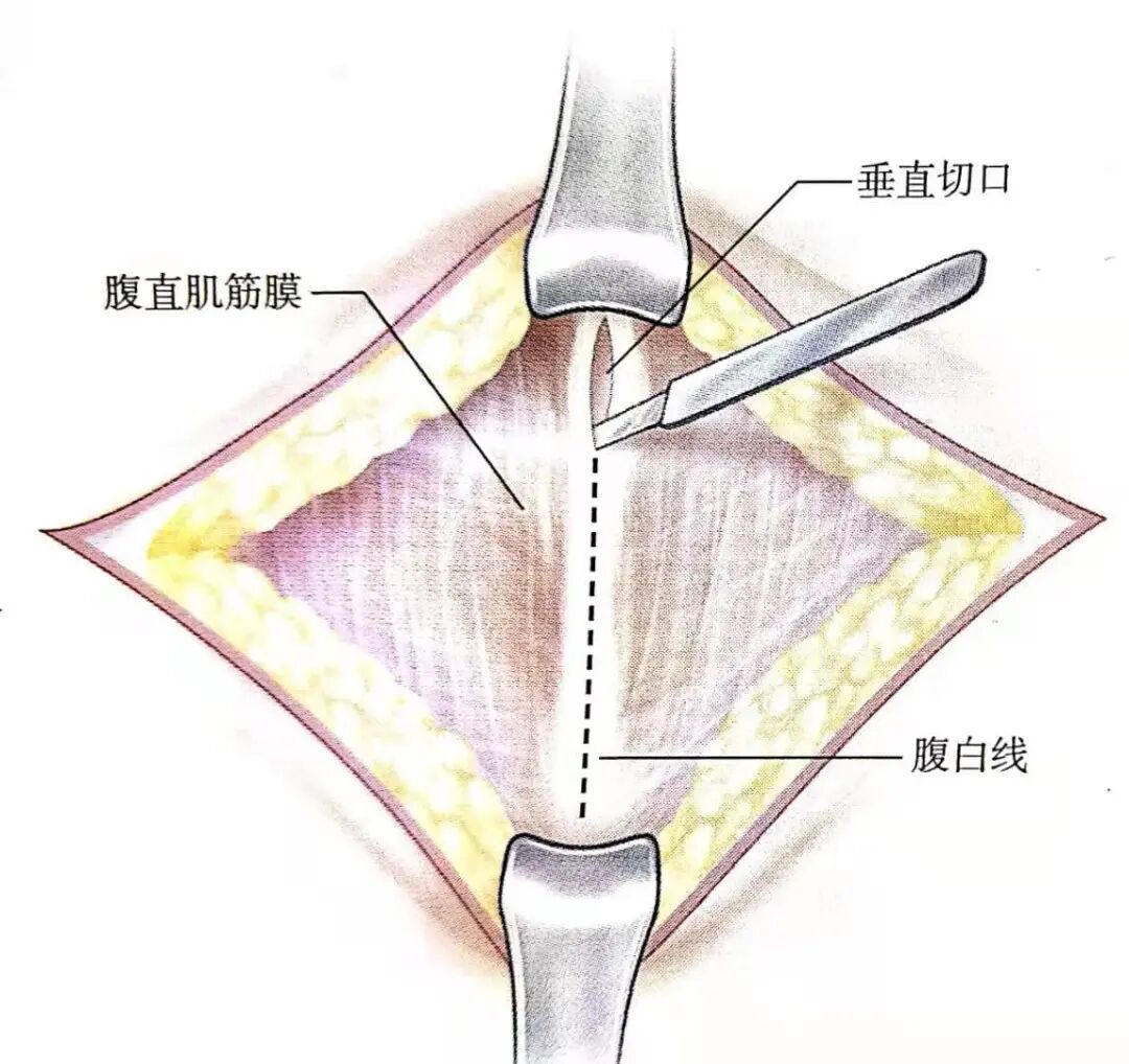 - 清除腹直肌鞘内的脂肪组织,在肌腹间纵行切开腹白线,避免损伤下方的膀胱以及腹膜腔。膀胱基底以及尿道可以通过气囊导尿管辨别。