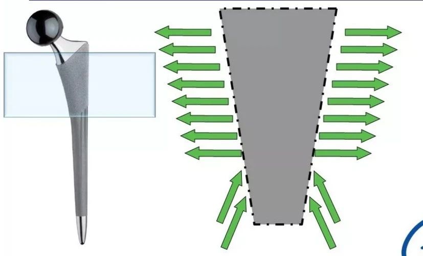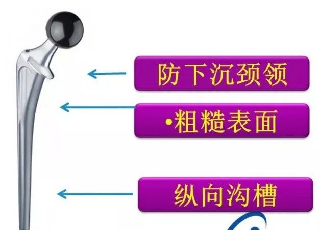 高抛光的表面使得假体与骨水泥床之间的磨损最小化,并允许假体有限的下沉,结合中置作用将轴向应力转化为对骨水泥床的横向压力。