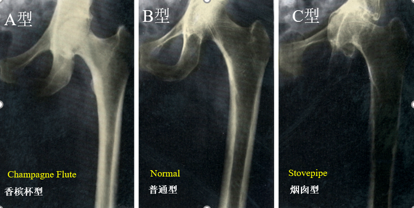 - TypeC 型:股骨髓腔内后侧皮质基本丢失,股骨髓腔显著增宽。形态如烟囱(Stovepipe).