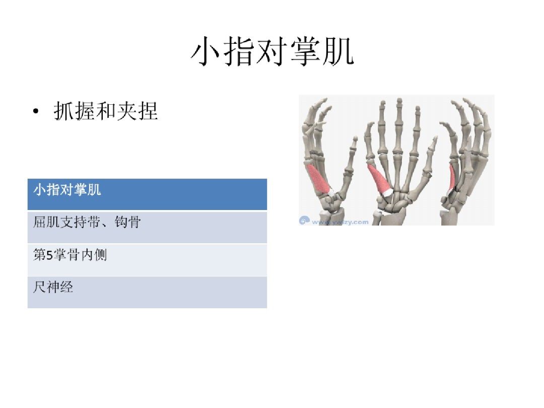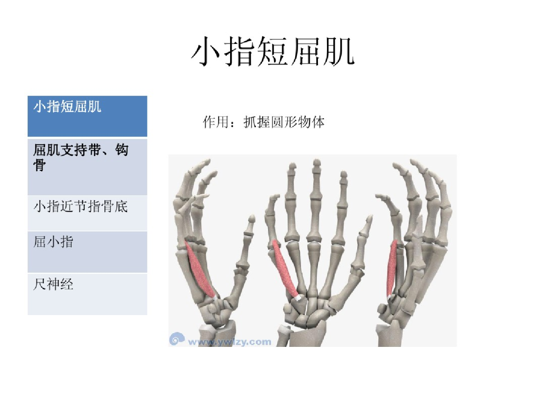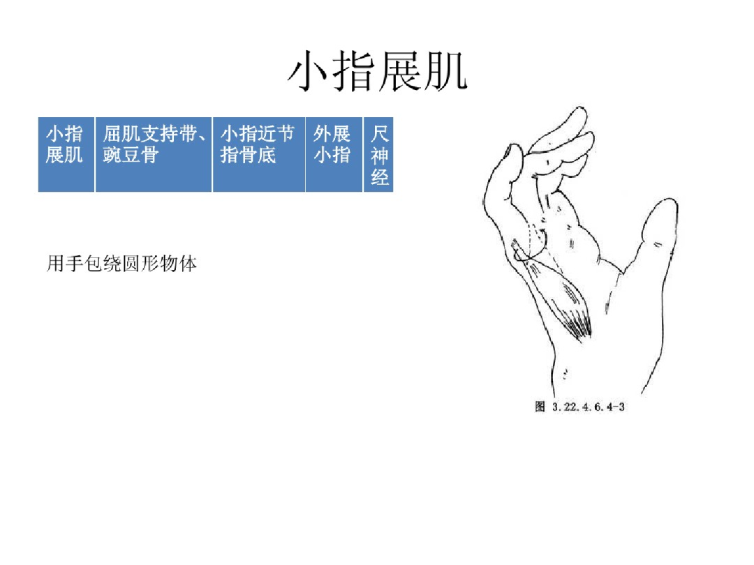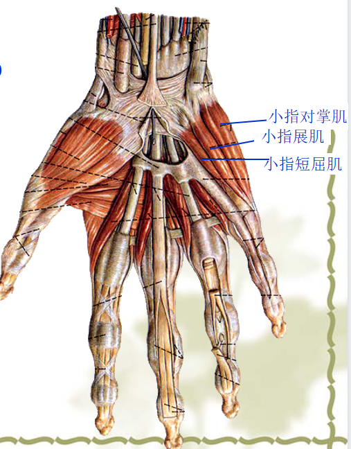 内侧群——小鱼际肌-尺N:掌短肌、小指展肌、小指短屈肌;小指对掌肌