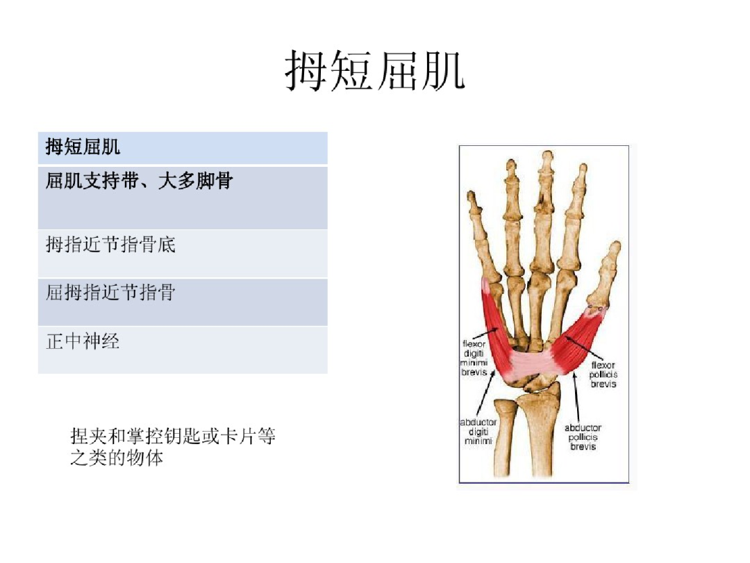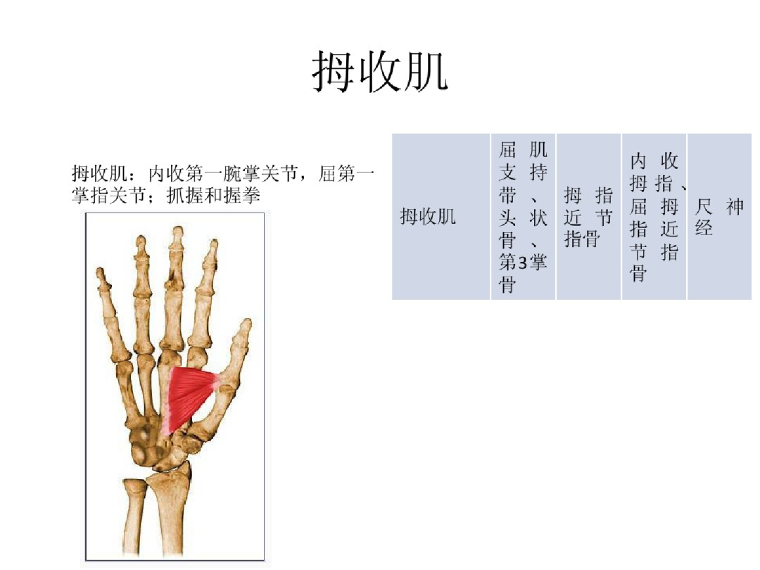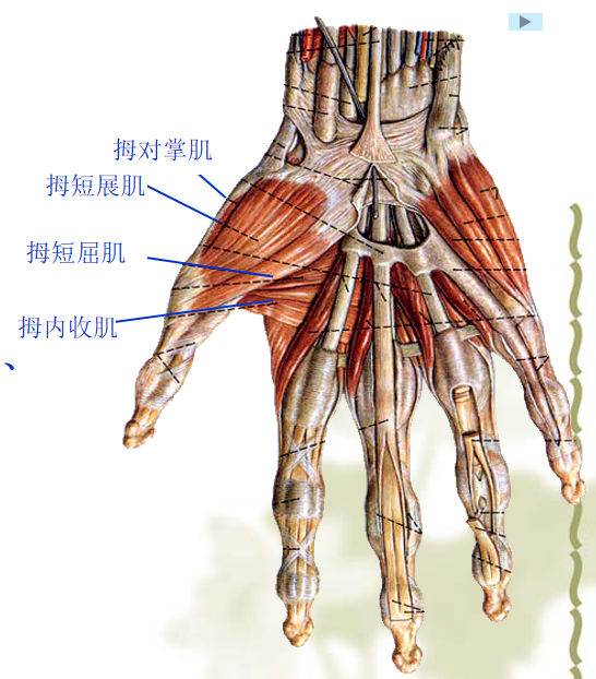 神经支配:1.正中神经:拇外展肌、对掌肌和拇短屈肌浅头;2.尺神经:拇内收肌及拇短屈肌深头