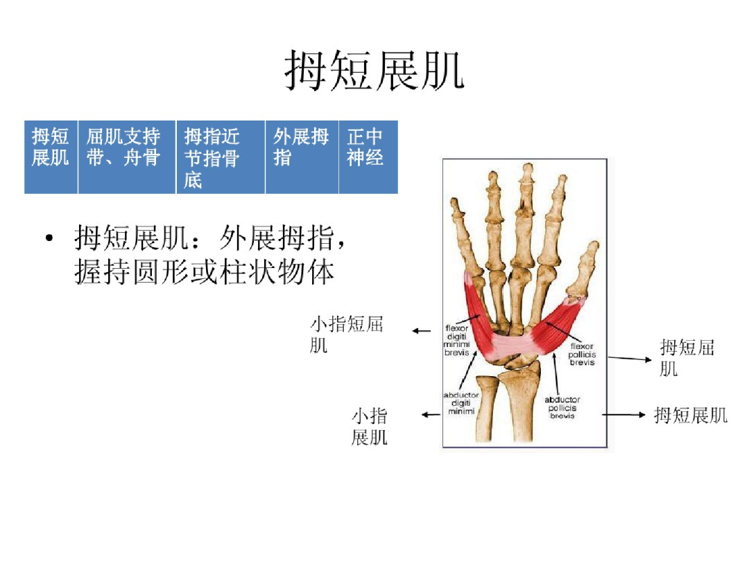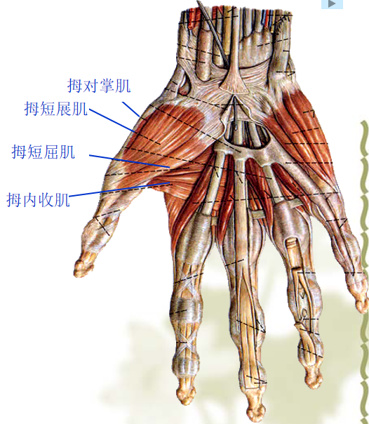 肌:拇短屈肌浅头、拇短展肌、拇对掌肌、第1、2蚓状肌