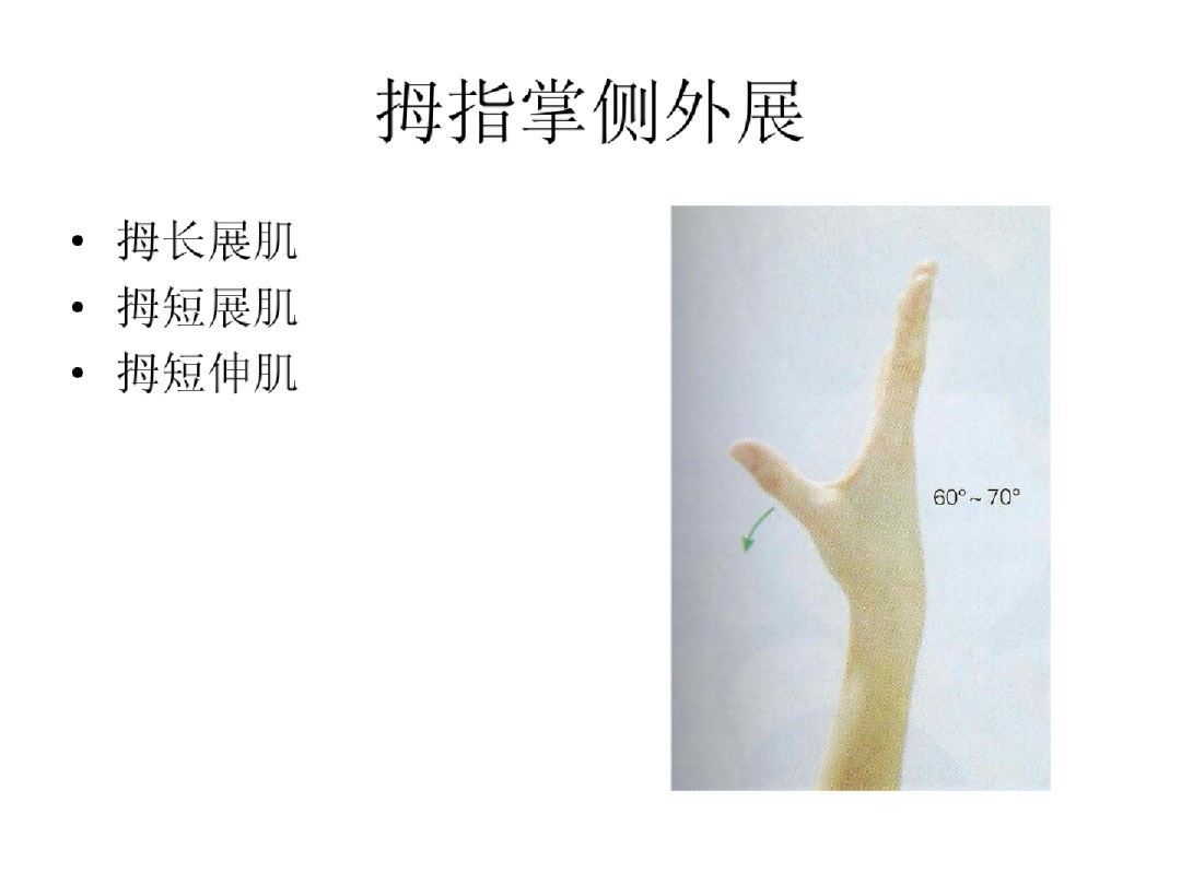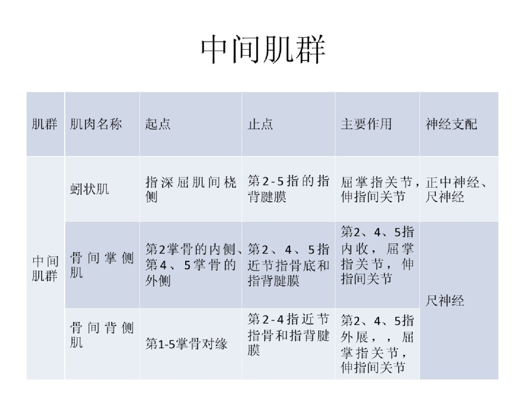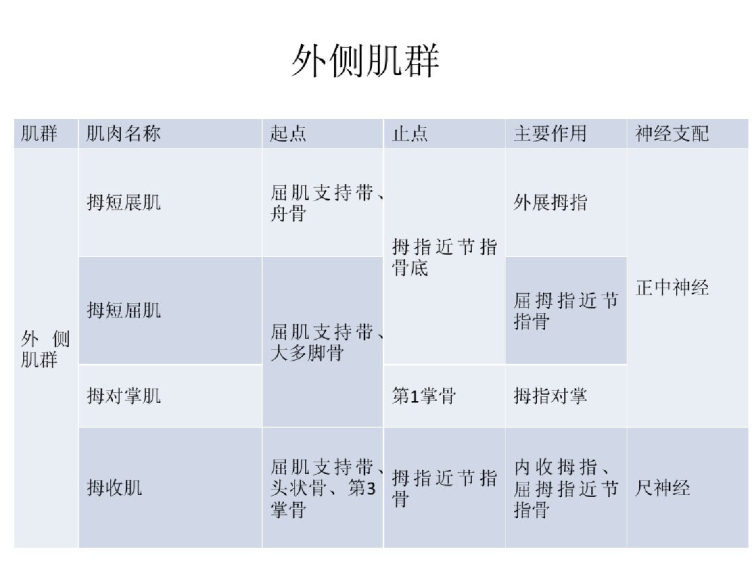 外侧群——大鱼际肌:外展-正中N、短屈(浅-正中N,深头-尺N);对掌-正中N、内收-尺N(横斜头)