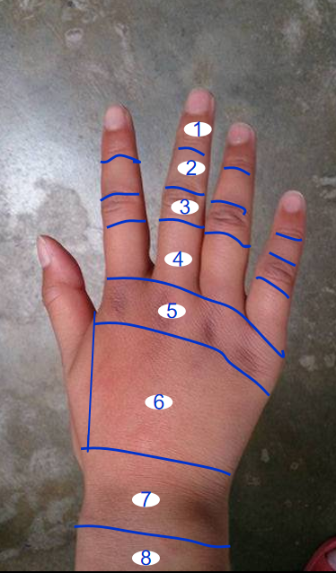 掌侧:(靠近中指一侧掌骨干近2/3-同侧近节指骨基底及腱帽)