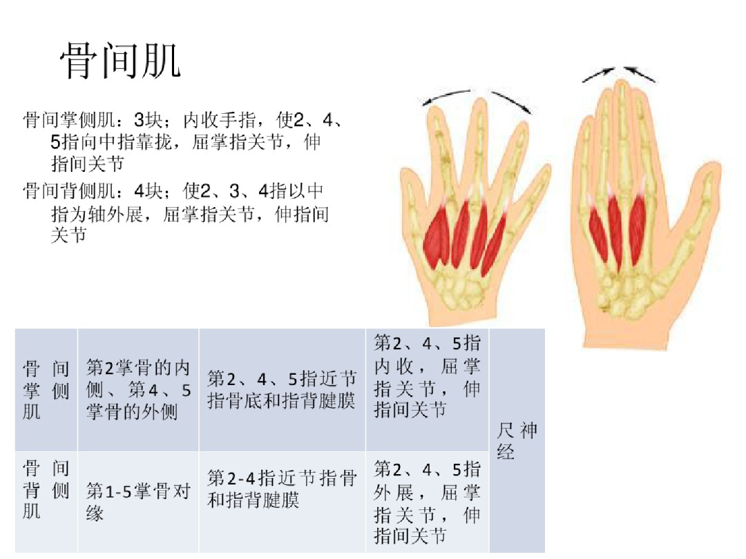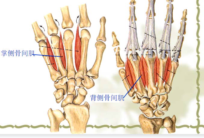 (2)骨间肌:(掌3,背4)