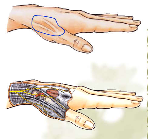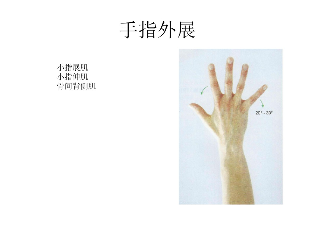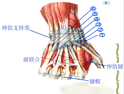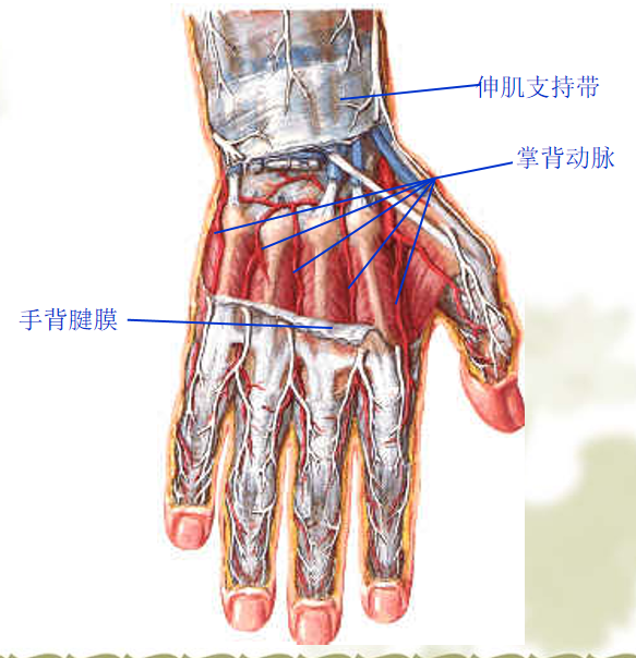 6.掌骨区:食小指有两条肌腱,腱联合存在,损伤后仍有部分伸指功能。
