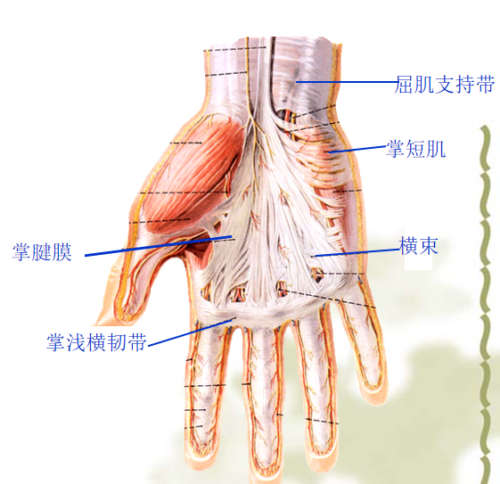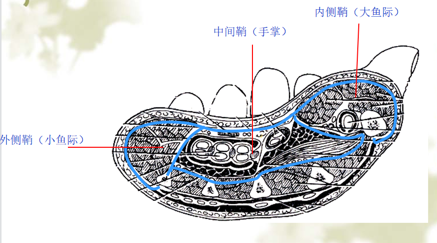 浅层:鱼际筋膜、小鱼际筋膜、掌腱膜