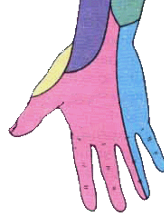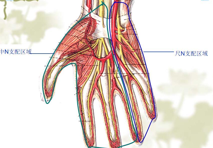 分布:皮肤:肌:小鱼际肌第3、4蚓状肌所有骨间肌、拇收肌、拇短屈肌深头