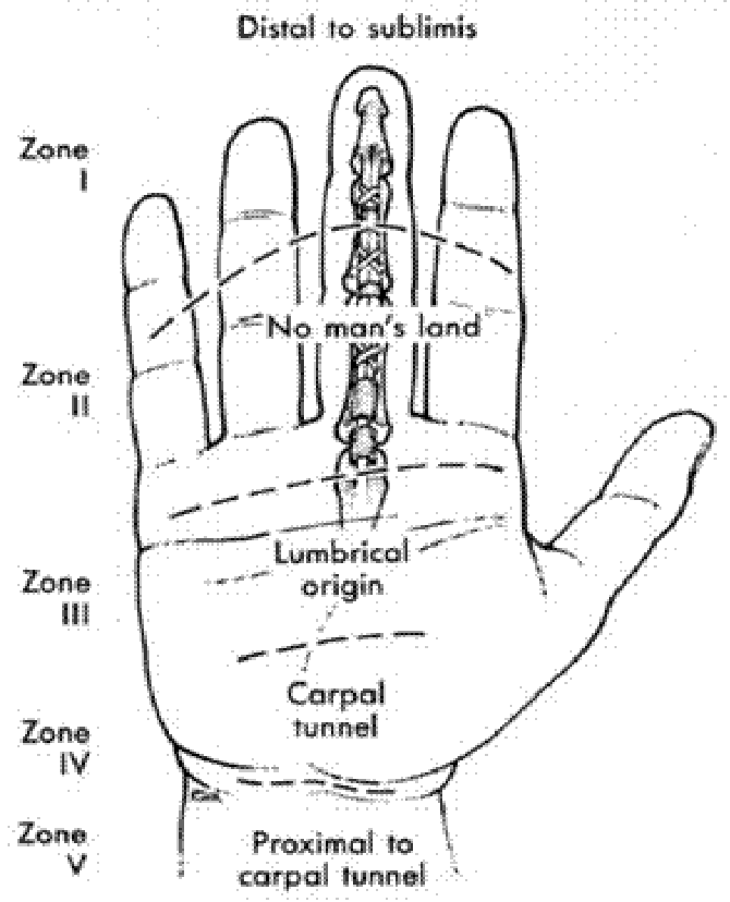 I区:中节(拇指近节)中部---肌腱止点。只有一条肌腱,肌腱断裂距止点1cm以内,近端前移止点固定或只行肌腱吻合。