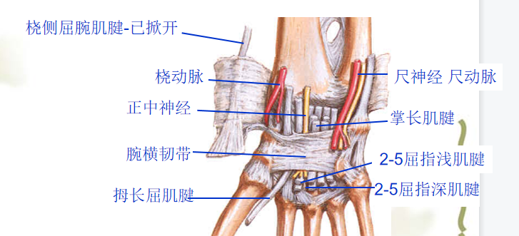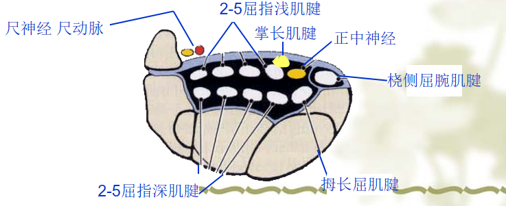 由屈肌支持带和腕骨沟共同构成。管内有指浅、深屈肌腱和拇长屈肌腱及其腱鞘以及正中神经通过。