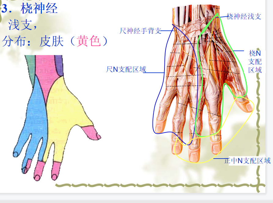 1)尺神经浅支(蓝色)小指尺(掌)侧固有神经指掌侧总神经