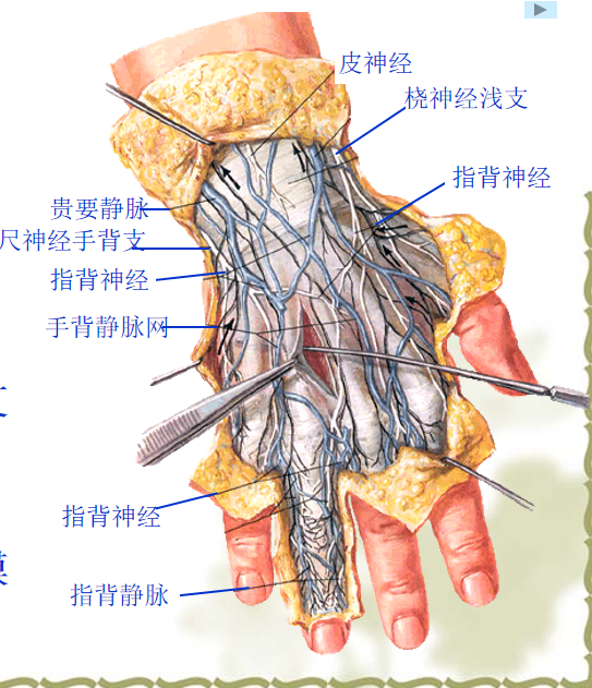 (二)浅筋膜1.手背静脉网;2.皮神经:(1)桡神经浅支;(2)尺神经手背支