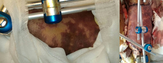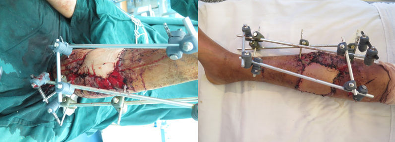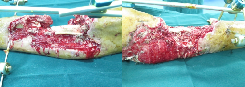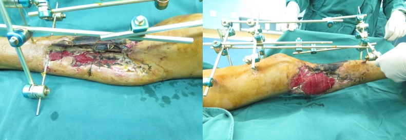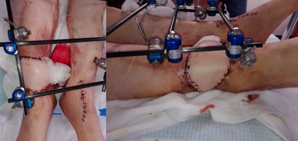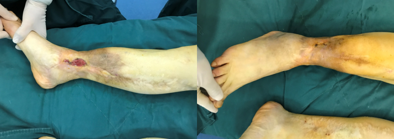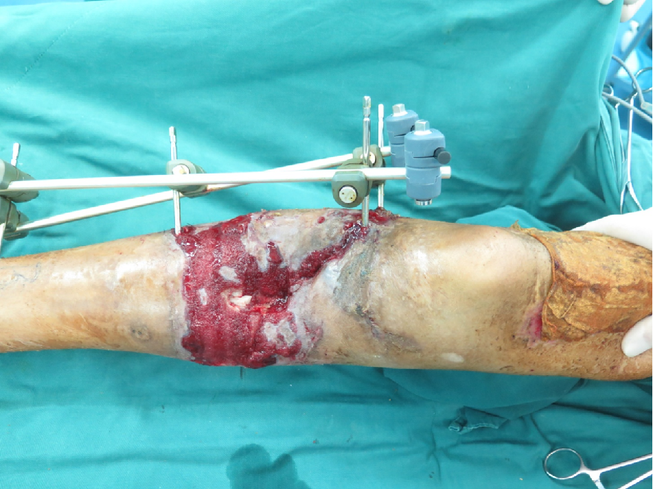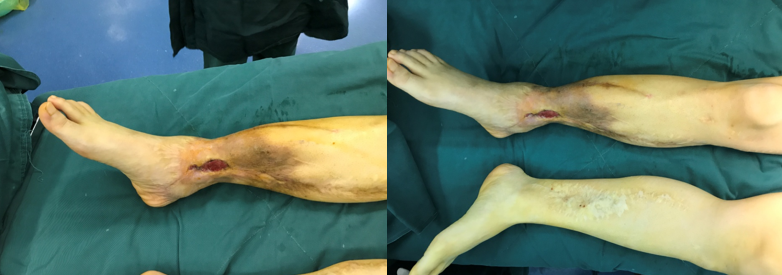 赵某某,男,42岁,车祸致左小腿开放性骨折。2017年11月20日因车祸致左小腿开放性骨折,多次手术治疗,左小腿大面积皮肤及肌肉坏死、缺损,左胫骨上段骨质坏死,行清创术后,左小腿上段前侧大面积骨质肌肉皮肤缺损,于2018年1月16日行皮瓣手术治疗。