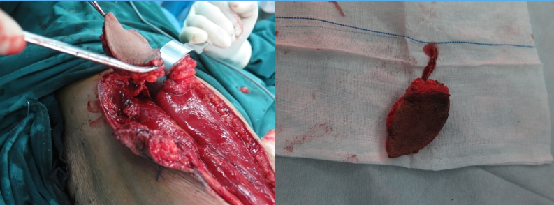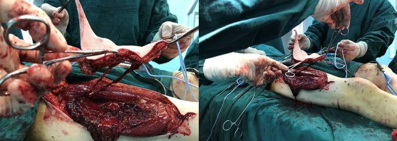 4、在解剖血供蒂的过程中,应注意保护好伴随旋股外侧动脉降支走行的股神经及其肌支。