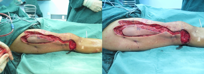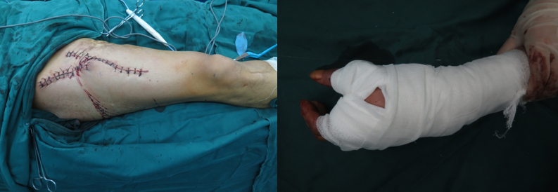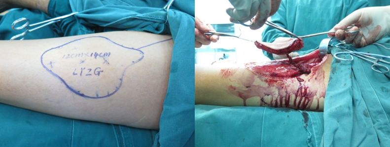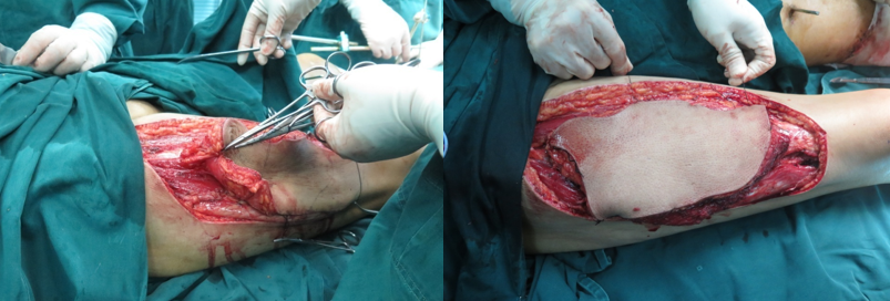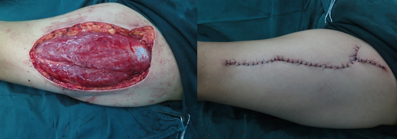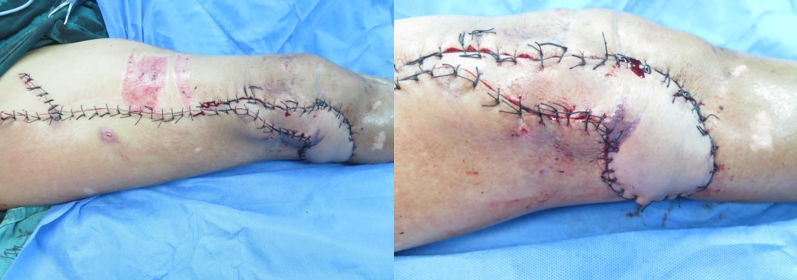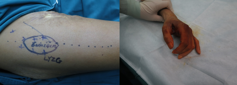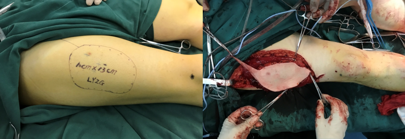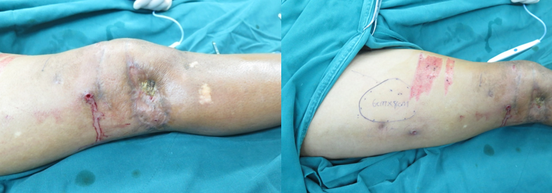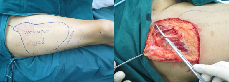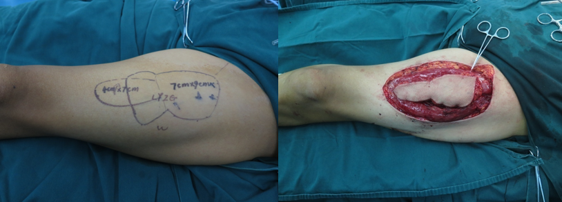 3、感染性皮肤软组织缺损,股前侧外侧皮瓣血供丰富,皮瓣面积大,组织量充足,适用于感染创面,尤其是慢性、大面积感染创面的修复。