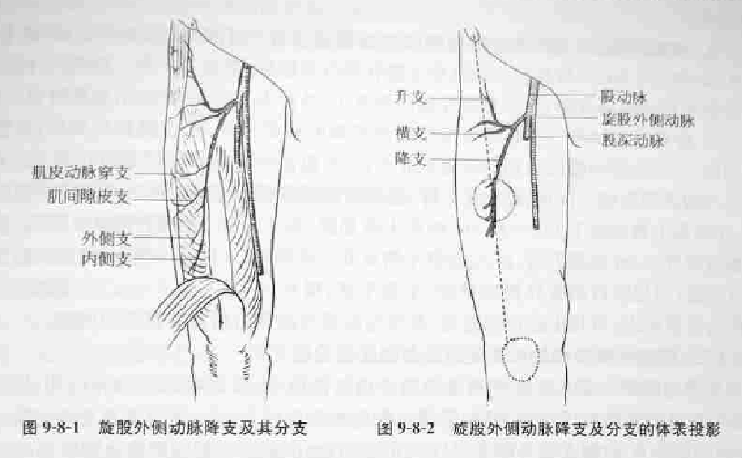 旋股外侧动脉自股深动脉发出后很快分为升支、横支、降支。其中降支最粗,行程最长。降支在股直肌和股外侧肌之间行向外下方,其体表投影为髂前上棘与髌骨外上缘(髂髌线)连线中点与腹股韧带中点做一连线,这连线的下2/3段即为降支的体表投影。