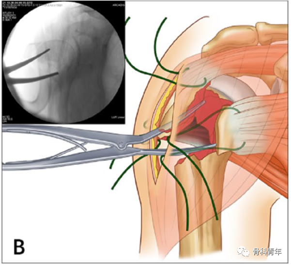2. 预留肩袖缝线,将撑开器自外侧插入骨折间隙并撑开。
