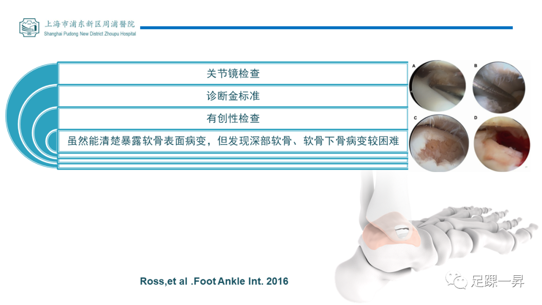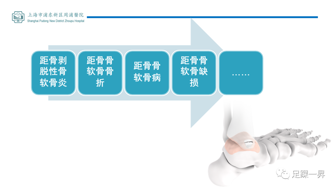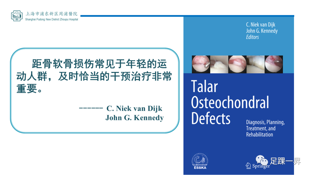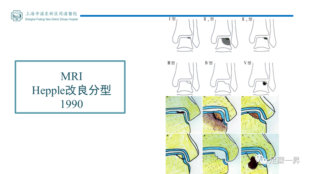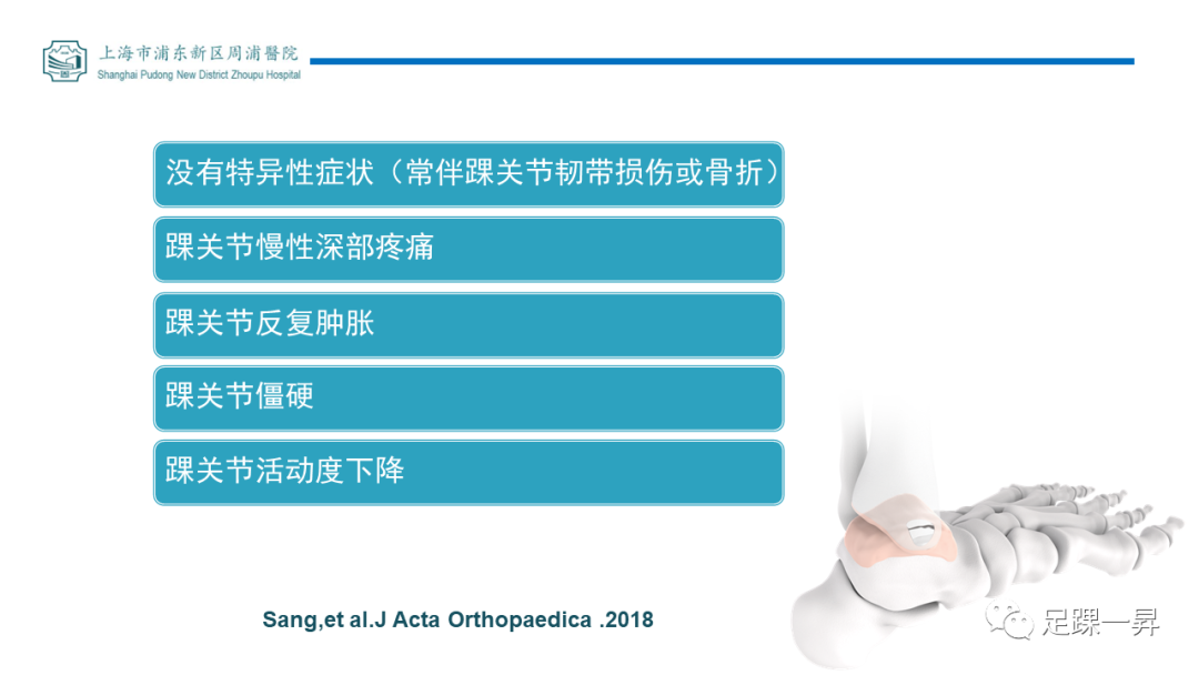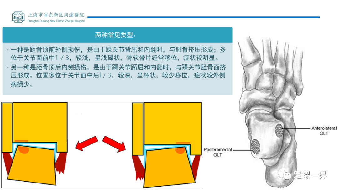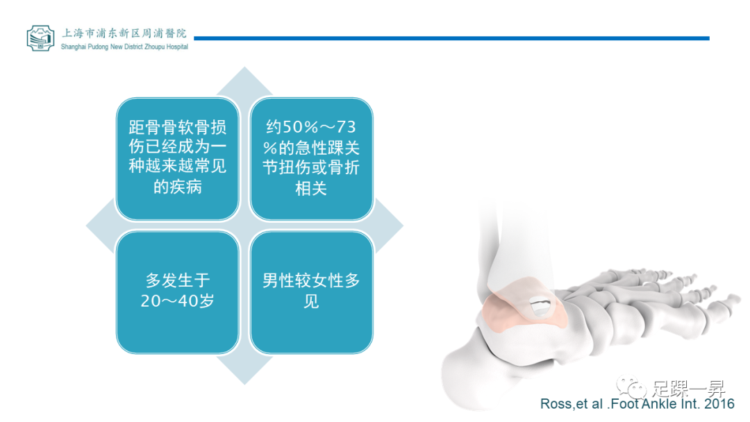 距骨骨软骨损伤Osteochondral Lesions of the Talus(OLT)是临床常见的踝关节病变,常伴有踝关节外伤病史,往往是踝关节慢性疼痛的病因之一。距骨骨软骨损伤是指距骨关节面软骨连同软骨下骨的损伤,多表现为局部关节软骨剥脱,并可累及深部的软骨下骨。大多数距骨骨软骨损伤都是由踝关节骨折和踝关节扭伤等创伤引起的。是踝关节慢性疼痛的主要病因之一,多见于男性,通常发生在 20~30 岁之间,约10%双侧受累。距骨骨软骨损伤的发病机制和创伤、遗传因素相关,具体病因尚不明确。目前认为创伤和反复的慢性损伤,如踝关节反复扭伤,崴脚是引起距骨软骨损伤的主要因素。98%的距骨顶内侧和 70%的距骨顶外侧的距骨骨软骨损伤与创伤有关。对于不同程度的距骨骨软骨损伤,依据不同的检查有各式各样的分型。根据不同分型也有相适应的治疗方案。