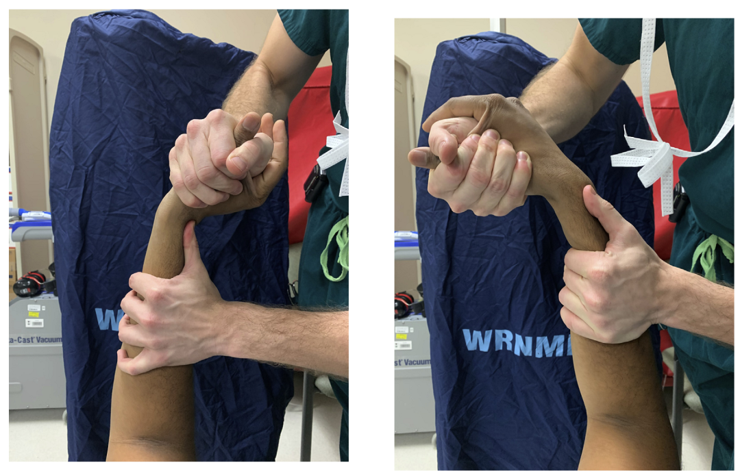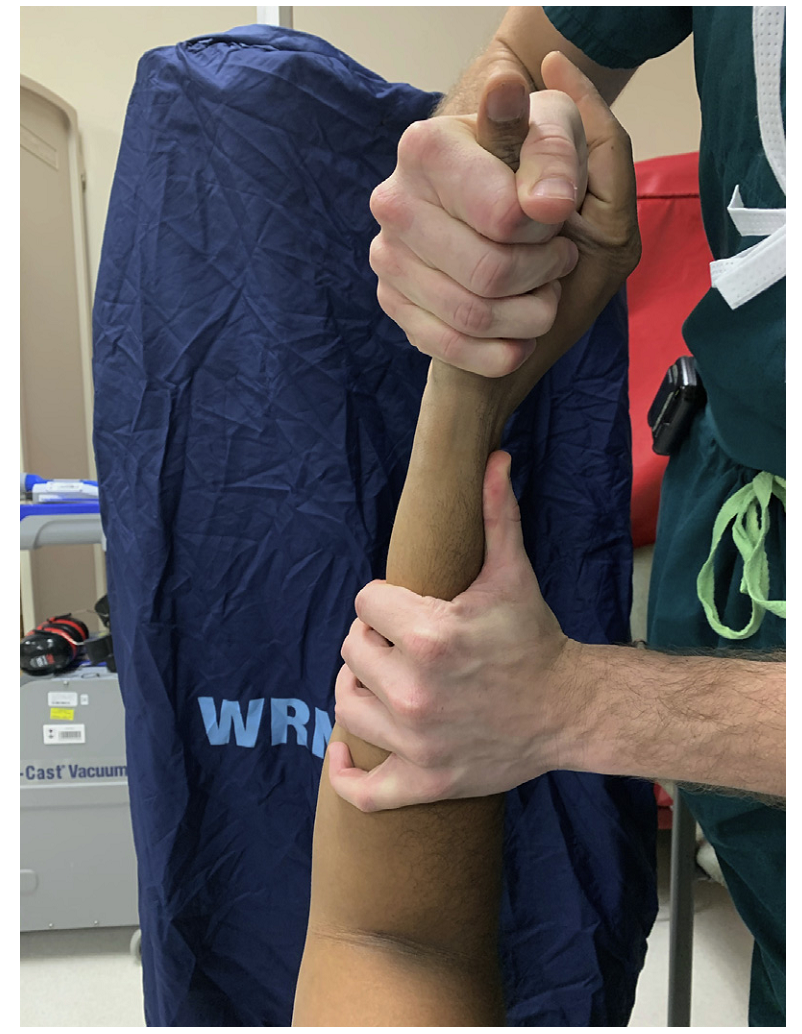 3、手法复位,术者拇指置于骨折远端,牵引恢复桡骨远端高度,手相对于桡骨远端/腕关节的掌屈和旋前有助于恢复掌倾角和尺偏角。