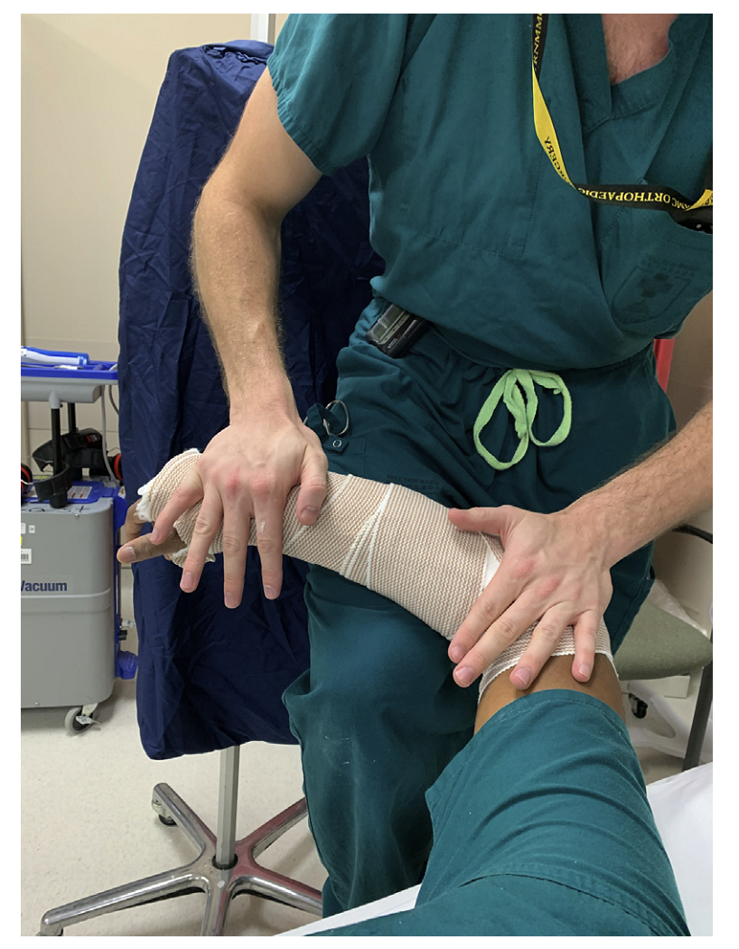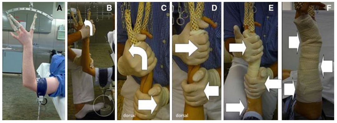 4、外固定,注意石膏的三点塑形(3-point mold)。上图为使用双手和大腿