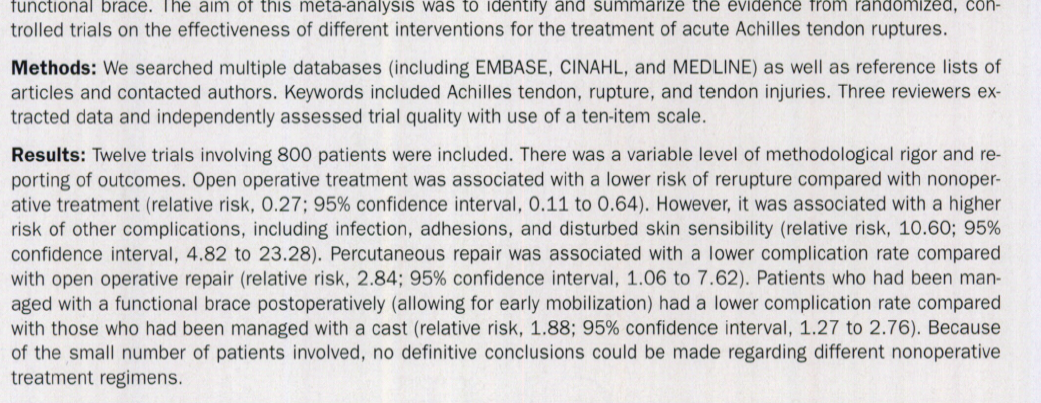 Meta分析总结随机、对照实验文献追踪了EMBASE CINAHL MEDLINE等3个数据库,关键词包括:跟腱、断裂、腱损伤,并联系作者 。3位学者分析数据、使用10项标准独立评估实验价值。包括12项研究,设计800名患者