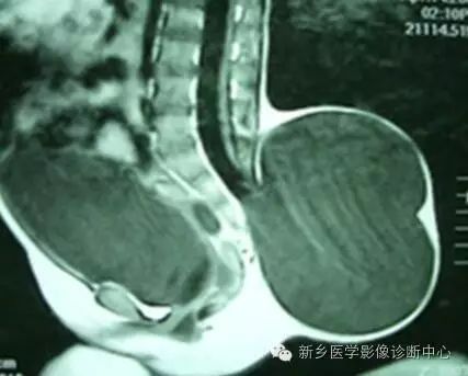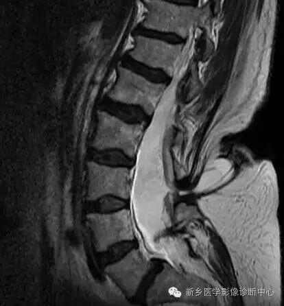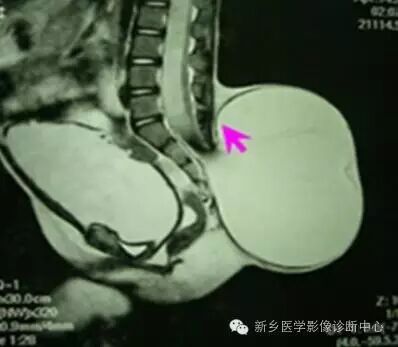 MR:脊膜膨出:囊性肿块,与鞘膜囊想通;