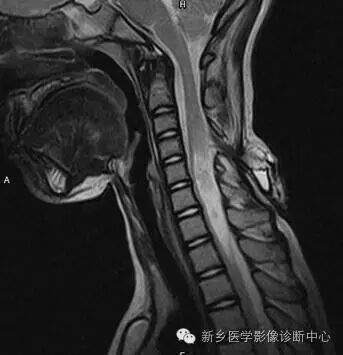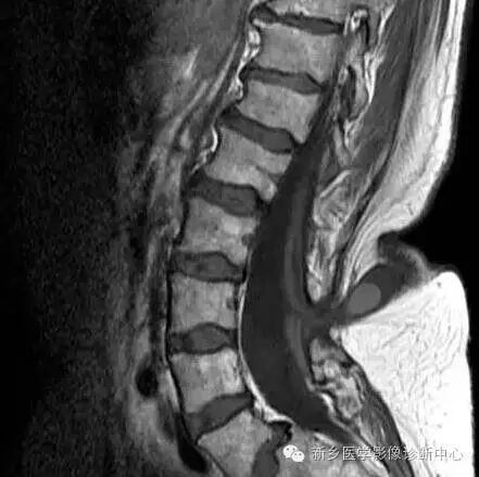 脊柱MRI提示椎管内占位及相应水平椎体后缘扇贝样压迹(白箭)